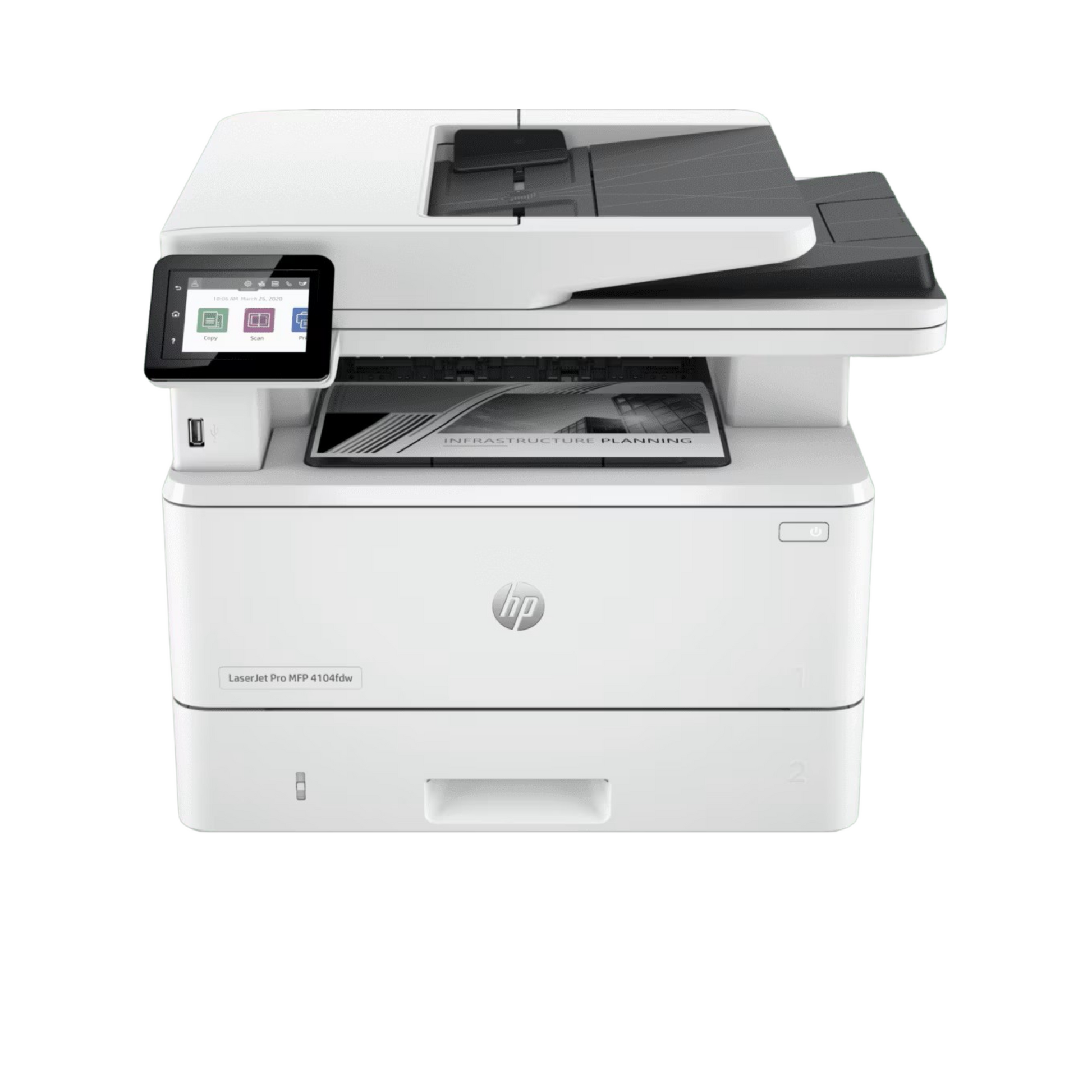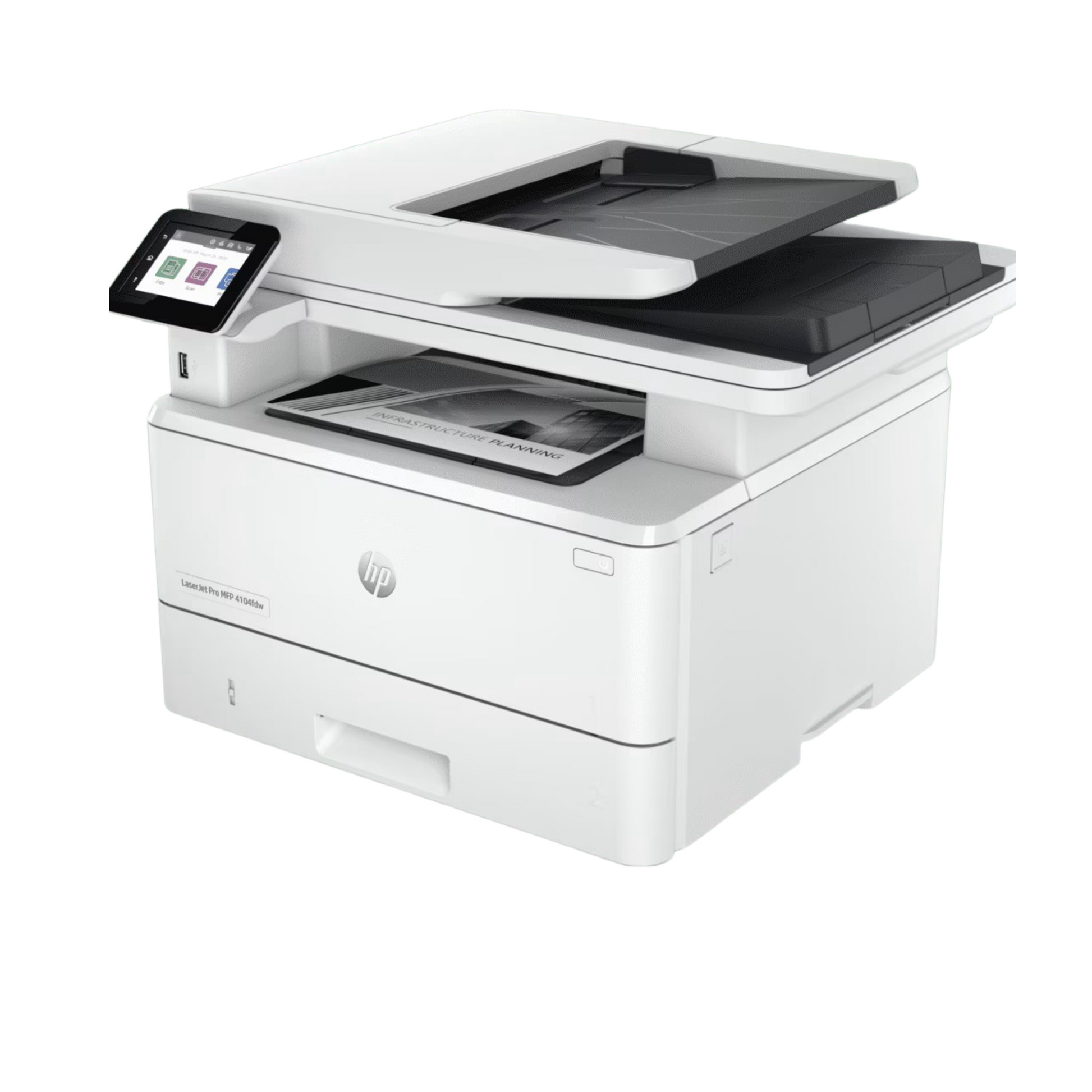 The HP LaserJet Pro MFP 4104fdw is a premium all‑in‑one monochrome laser printer tailored for small teams and growing businesses. With blazing print speeds, robust duplex scan/copy functionality, built‑in fax, and enterprise-grade security, it enables high‑efficiency workflows with minimal hassle. Its mobile connectivity, expandable paper capacity, and secure toner ecosystem make it a reliable and future-ready office solution.